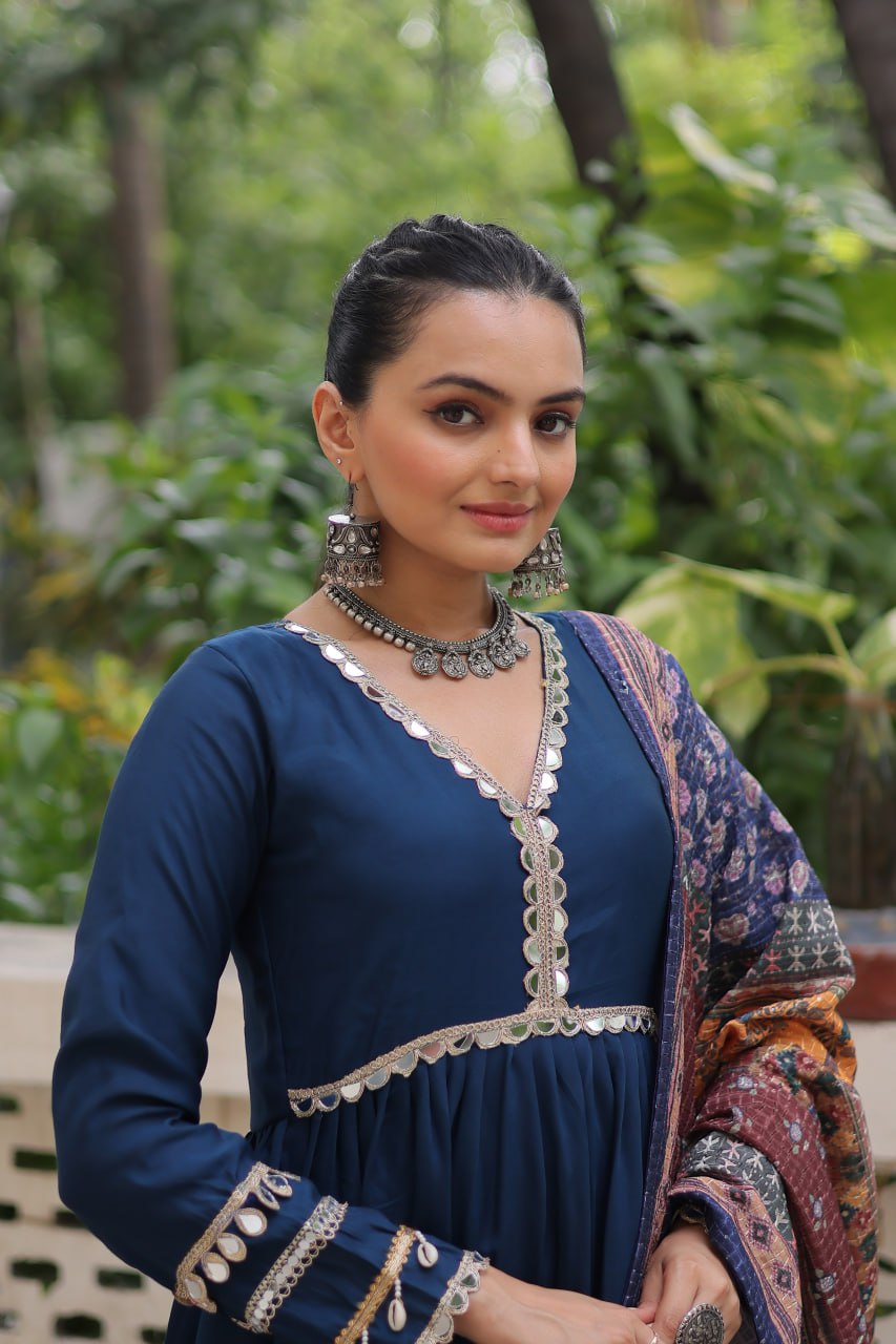 👉🏻 FABRICS & WORK :- Roman Fabrics With Frill Stitching and mirror lace work